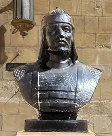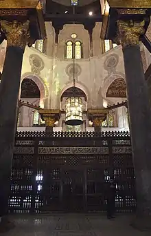 Qalawun's early reign was marked by policies that were meant to gain the support of important societal elements, namely the merchant class, the Muslim bureaucracy and the religious establishment.[73] Among these early policies were the elimination of illegal taxes that burdened the merchant community and extensive building and renovation projects for Islam's holiest sites, such as the Prophet's Mosque in Medina, the al-Aqsa Mosque in Jerusalem and the Ibrahimi Mosque in Hebron.[75] Following the détente with the Ilkhanate after 1280, Qalawun launched a wide arrest campaign to eliminate internal dissent, imprisoning dozens of high-ranking emirs in Egypt and Syria.[76] The détente also saw a shift in Qalawun's building activities to focus on more secular and personal purposes, including a large, multi-division hospital complex in Cairo across from the tomb of as-Salih Ayyub.[77] Construction of the hospital, a contrast from his Mamluk predecessors who focused on establishing madrasas, was done to gain the goodwill of the public, create a lasting legacy, and secure his spot in the afterlife.[77] Its location facing as-Salih's tomb was meant demonstrate Qalawun's lasting connection to his master and to honor the Salihiyyah.[77] While the Salihi mamluks were typically Kipchak Turks, Qalawun diversified mamluk ranks purchasing numerous non-Turks, particularly Circassians, forming out of them the Burji regiment.[78]