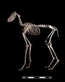 The skull can be identified by its reduced carnassials, small upper incisors, and long canine teeth.[16] Like other canids, it has 42 teeth with the dental formula 3.1.4.23.1.4.3 × 2 = 42. The maned wolf's rhinarium extends to the upper lip, similar to the bush dog, but its vibrissae are longer.[16] The skull also features a prominent sagittal crest.