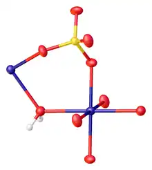 Coordination sphere for Mn and S in the monohydrate. The O6 coordination sphere is provided by four separate sulfate groups and a pair of mutually trans bridging aquo ligands.[2]