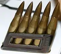 Yugoslavia[7] converted at least some of their captured M1895s to 7.92×57mm Mauser, fed by stripper clips instead of the original model's en bloc clip system. This conversion was designated M95/24 and M95M. The M95/24 is often mistakenly attributed to Bulgaria, but 8×57mm IS was never a standard cartridge of the Bulgarian military.[8] These conversions are prized by collectors for their relative scarcity and chambering in a commonly available round, but suffer from a fragile extractor and a lack of replacement parts.