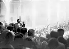 Simó's position towards the regime remained ambiguous and one scholar names him the leader of a local Valencian "grupo semicolaboracionista", dubbed also "grupo simonista".[116] On the one hand, it supported the idea of doing away with the corrupted restoration regime and saw the military as an agent of change; on the other, it was anxious to retain its own identity and not to melt down in broadly designed and amorphous institutions of primoriverismo.[117] Hence, though Simó spoke at rallies of Unión Patriótica,[118] he did not enter the organisation;[119] it was rather his son Manuel Simó Attard who did join[120] and remained active in the UP youth branch.[121]