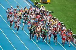 The championship records for the event are 2:06:54 hours for men, set by Abel Kirui in 2009, and 2:20:57 hours for women, set by Paula Radcliffe in 2005.[1] The world record has never been broken or equalled at the competition by either men or women, reflecting the lack of pacemaking and athletes' more tactical approach to championship races.[2]