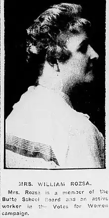 A member of the school board in Butte in 1914,[10] Margaret Rozsa was described in The Suffrage Daily News as "one of the prominent state suffrage workers" who would be marching in the women's suffrage parade in Helena on Friday evening, September 25, 1914. Other prominent suffragists slated to march in the parade, which was being held in conjunction with the Montana State Fair that year, were Dr. Anna Howard Shaw, president of the National American Woman Suffrage Association, and Jeannette Rankin, who would later become the first woman elected to the U.S. House of Representatives. Rozsa was also slated to speak at events related to the march.[11]