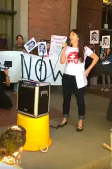 Having experienced a no-cause eviction as a young single mother in Portland, and again in 2012 with a husband and children, Black became increasingly alarmed by the growing Portland housing crisis and skyrocketing eviction rates that displaced longtime low and moderate income Portland residents and broke up geographic centers of communities of color.[12] Black initiated social media-based mutual aid with the Facebook group PDX Renters Unite, began working with others including Chloe Eudaly who were also using social media networks to mobilize around renters rights, and conducted research as a member of a Portland City Club study group on affordable housing.[13] In 2015, Black co-founded Portland Tenants United (PTU), which pursued multiple methods of pressing for tenant rights. Black and PTU have supported renters in organizing tenant unions with actions including taking demands to building complex owners and managers, rent strikes, generating media coverage, and securing support from local officials.[14][15][16] PTU has organized protests demanding a rent freeze and an end to no-cause evictions,[17][18] and joined resistance to sweeps against camps of houseless people.[19]