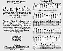 The oldest extant print of "Maria, breit den Mantel aus" is in a booklet of four Marian hymns published by the Innsbruck music publisher Michael Wagner, under the header "Vier schöne newe geistliche Lieder, Von vnser lieben Frawen der Himmelkönigin Maria vnnd Muetter der Barmhertzigkeit, Gemacht vnnd gesungen zue ehren der Wunderthättigen Bildtnuß vnser lieben Frawen von Foy, welche zue Ynßprugg in der Kirchen der Societet Jesu, von jedermeniglich mit grosser Andacht verehrt wirdt, vnder dem Tittel der Muetter der Barmhertzigkeit" (Four beautiful new spiritual songs, of our dear Lady Queen of Heaven Mary and Mother of mercy, made and sung to honour the miraculous image of our dear Lady of Foy, which is honoured by everybody at the church of the Society of Jesus in Innsbruck with great devotion, under the title Mother of mercy.).[1] The song has 29 stanzas in this print,[2]:156 of uneven poetic quality. It is probably a compilation of older origins. The song remained in hymnals until the middle of the 18th century.