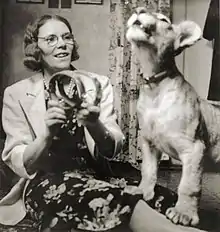 Maria Åkerblom with a cub of a lion in the early 1940s