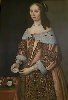 Magnus Gabriel De la Gardie with his spouse Maria Euphrosyne of Pfalz-Zweibrücken, the sister of King Charles X of Sweden. Painting from 1653 by Hendrik Munnichhoven. The picture is filled with symbolic details: Magnus Grabriel is standing lower than his wife because she is sister of the king; their holding hands symbolizes fidelity; the bean in Maria Euphrosyne's hand shows that she is pregnant. The painting is regarded as one of the finest from the early Swedish baroque era.
