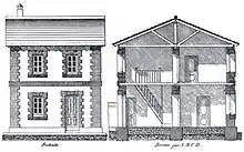 Belmás became active in the Sociedad Central de Arquitectos (Central Society of Architects), and from 1875 to 1882 was general secretary of the society. In 1876 he became editor of the society's official organ, the Revista de la Arquitectura Nacional y Extranjera (Review of National and Foreign Architecture).[1] The administration's 1878 bill on construction of working-class neighborhoods had raised interest in the subject of urban planning and economical construction.[2] Belmás began to explore the ideas of architectural hygiene and public housing.[1] In 1880 he presented models of compact houses with molded concrete walls, attached to form small blocks, as advocated by urban planners who thought the city plans should be based on small groups of modest houses.[3]