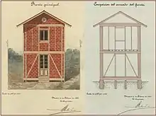 Belmás submitted his own proposal, following structural principles that had already been partially implemented by José Grases Riera. He called his system an "articulated skeleton". It had a flexible wooden framework filled with economically available materials such as manufactured brick, masonry or adobe to make a "a solid, undeformable, rigid and flexible unit". No foundation was required.[4] Belmás described his design as having perfect connections between all its elements, so even if the floor moved the house could sway but not break. He wrote that "even if the house fell and rolled, its frame would remain locked like a boat that suffered the hard attacks of the raging waves of the sea".[6] The people for whom the houses were intended had doubts about whether the innovative design was strong or functional.[6] Well-known architects such as Francisco Jareño y Alarcón and Juan Monserrat Vergés cast doubts on whether the houses would be adequate for the harsh climate of the region.[7][lower-alpha 2]