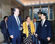 Mitsotakis served as the Spouse of the Prime Minister from 1990 to 1993 during her husband's tenure as head of government.[1] She assumed the traditional role of the wife of a Prime Minister, being quoted in Time Magazine at the time of the 1990 election saying, "Finally, my Kostas, we've made it."[2] However, she was known for her political skills and outspokenness. In 1990, soon after taking office, Prime Minister Mitsotakis made his first appearance in the Greek parliament. A member of the Panhellenic Socialist Movement (PASOK) accused Marika of making "insolent gestures" towards socialist politicians during the session.[2] Marika responded to the lawmaker's accusation, "I'll get my stick and beat you with it."[2] In 1991, Marika publicly criticized Minister of Industry Stavros Dimas.[2] Dimas quickly resigned during an official trip to the Soviet Union as a result of Marika's criticism.[2]