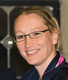 Mohnen was part of the team that won the European Championship for the sixth time in a row in Nazareth in 2011, thereby qualifying for the 2012 Summer Paralympic Games in London. As part of the team's preparation, they toured the United States and Australia.[11][12] Mohnen was captain of the team in London. In the gold medal match in London, the team faced the Australia women's national wheelchair basketball team,[13] who had defeated them 48–46 in Sydney just a few months earlier,[14] in front of a capacity crowd of over 12,000 at the North Greenwich Arena,[13] that included Mohnen's mother Kati and sister Sonja.[2] The German team had been undefeated up to that point, but had started slowly in its games against the United States and China, winning both games by six-point margins, and seemed to play their best basketball only in the final minutes of a game.[15] They defeated the Australians 44–58 to win the gold medal,[13] the first that Germany had won in women's wheelchair basketball since 1984, a 28-year period.[16] Mohnen contributed eleven points.[2] They were awarded the Silver Laurel Leaf by President Joachim Gauck in November 2012,[17] and were named Team of the Year for 2012.[16] Bitburg honoured Mohnen by entering her name into the Golden Book of the city.[2]
