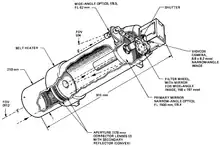 The infrared radiometer detected infrared radiation given off by the surface of Mercury and the atmosphere of Venus, from which the temperature could be calculated. How quickly the surface lost heat as it rotated into the planet's dark side revealed aspects about the composition of the surface, such as whether it was made out of rocks, or out of finer particles.[40][41] The infrared radiometer contained a pair of Cassegrain telescopes fixed at an angle of 120° to each other and a pair of detectors made from antimony-bismuth thermopiles. The instrument was designed to measure temperatures as cold as −193 °C (−315.4 °F) and as hot as 427 °C (801 °F). Stillman C. Chase, Jr. of the Santa Barbara Research Center headed the infrared radiometer experiment.[39]