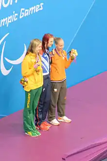 Two years later van der Kulk was back representing the Netherlands, this time in London for the 2012 Summer Paralympics. In her first event, the 100m backstroke, she posted a time of 1:09.98, coming in second to Britain's Chloe Davies, but her time was good enough for her to qualify for the final. In the final later that evening she swam an improved time of 1:09.50 just 4 hundredths of a second behind second placed Taylor Corry, to give van der Kulk the bronze, her first Paralympic medal. Two days later in the 200m freestyle she won her heat with a time of 2:14.43. In the final van der Kulk swam slightly slower with a time of 2:14.80, but it was enough to push Australia's Kayla Clarke into fourth place to give van der Kulk her second Paralympic bronze. Her final event was the 100m breaststroke. By winning the first heat in the inaugural SB14 100m backstroke, van der Kulk, by default, set a new Paralympic record. This record was short-lived being taken from her moments later in the second heat by teammate Magda Toeters. In the final, van der Kulk came sixth.[2]
