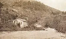 The power plant was supported by a 51-metre (167 ft) long and 2.4-metre (7 ft 10 in) high dam which diverts water into a canal on the river's southern bank that supplies the power station downstream.[4] At first, the power plant utilized two 125 kW (168 hp) generators which operated single-phase alternators at a frequency of 60 hertz. In the next year, the plant powered 180 light-bulbs. In the following years, a third generator was added to the plant and it powered over 700 light-bulbs and contributed to industrial and public use in the city.[1] By 1896, the power plant was decommissioned as new and improved plants such as the Marmelos I, IA and II were built that could better utilize the Marmelos Falls.[1] Marmelos I is also decommissioned while IA and II continue operations with a capacity of 4 MW (5,400 hp).[4][5]