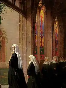 Canto 2 (The Convent): The Abbess of Whitby, with a party of nuns including a novice Sister Clare, journeys by sea to Lindisfarne, where she forms one of a tribunal in sentencing Constance de Beverly to be immured alive together with an accomplice in the planned murder of Clare. In her final speech Constance tells how she had escaped from a convent to join Marmion who had then abandoned her for the wealthy Clare, charging Clare's fiancé with treason and defeating him in armed combat.