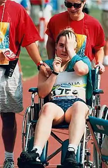 Australian athlete Marsha Green is assisted from the track at the 1996 Atlanta Paralympic Games