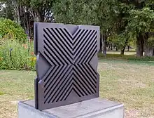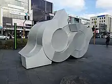 After graduating from Elam, Szirmay won the Smirnoff Sculpture Award (1969) for a monumental outdoor piece rendered in curved, polished aluminium in the busy centre of Newmarket, Auckland.[6] This work was fabricated to her instructions by Roskill Sheet Metal Works.[4] This work represented a radical move for public art in Auckland, and it was the first large abstract work to be commissioned for the city.[4] The brutalist look and feel and utilitarian construction was designed to remind passersby of the industrial history of Newmarket and the highly reflective surfaces were intended to mirror the hustle and bustle of the surrounding streets.[7] It is located beside Lumsden Green, close to the Khyber Pass Road–Broadway intersection at Newmarket, counterpoised with Virginia King's Sliver across the pedestrian crossing.[8] For nearly ten years, Szirmay continued to work with metal as her preferred medium.