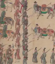 The Chief Martial Arts Office and the Deputy Chief Martial Arts Office wore red military uniforms and carried swords while serving as guards. The remaining 87 members of the Gate Martial Arts Office (문무예청 ( Munmu Muyecheong Mugam (門武藝廳武監)) wore red-colored Hongcheolik and yellow Hwangchorip hats (黃草笠), with tiger beards attached to their caps, and the red cheollik (철릭, a type of traditional Korean garment).[2][4][1]