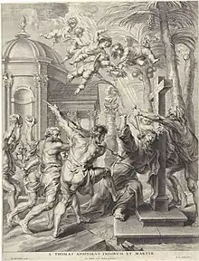 The Martyrdom of Saint Thomas is an oil on canvas painting, painted by Flemish painter Peter Paul Rubens in the years 1637-1638. It depicts St. Thomas the Apostle's martyrdom in Chennai, India on 3 July in 72 CE and was painted for the altar of the Barefoot Augustinian church in Prague, St. Thomas's Church.[1] The Martyrdom of Thomas is notable for Rubens's erroneous use of classical architecture to depict an Indian building in the background of the image and his fantastical depiction of a Hindu god.[2] This painting is now in the collection of the Národní Gallery in Prague.