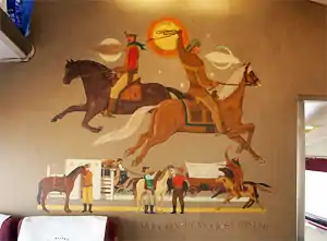 In the 1940s the architect John Harbeson commissioned Lawser to create a series of murals depicting historical scenes to decorate the railroad cars of the California Zephyr.[3][4] Lawser also created decorations for railroad cars for the New York Central Railroad, the Atchison, Topeka and Santa Fe Railway, the Seaboard Air Line Railroad, the Denver and Rio Grande Western Railroad, the Western Pacific Railroad, and the Denver Zephyr for the Chicago, Burlington and Quincy Railroad.[3]