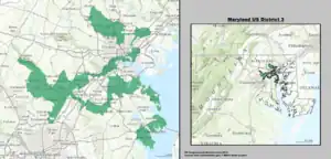 The district's previously odd shape was attributed to gerrymandering to favor Democratic candidates, following the 2000[3] and 2010[4] censuses. In 2012, the district was found to be the third least compact congressional district in the United States,[5] and in 2014, The Washington Post called it the nation's second-most gerrymandered district.[6] John Sarbanes, the current Democratic Representative for the district, put forth the For the People Act of 2019 to address electoral reform, voting rights, and gerrymandering in the United States.[7][8] Following the 2020 redistricting cycle, it now comprises Howard County, most of Anne Arundel County including Glen Burnie and Annapolis, and part of Carroll County, specifically the areas around Mount Airy, and its incumbent representative John Sarbanes no longer lives in the district.