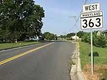 Maryland Route 363 (MD 363) is a state highway in the U.S. state of Maryland. Known for almost all of its length as Deal Island Road, the state highway runs 18.30 miles (29.45 km) from a dead end on Deal Island east to Mansion Avenue in Princess Anne. MD 363 connects Princess Anne and U.S. Route 13 (US 13) with the communities of Deal Island, Chance, and Dames Quarter on Tangier Sound in northwestern Somerset County. The state highway was constructed starting from Princess Anne around 1920, and reached Chance in the early 1930s. It was extended to Deal Island when a modern bridge to the island was constructed in 1940. MD 363 was extended to its present terminus on the island in the late 1950s.