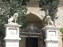 Atop each pillar is a lion statue.[11] These statues were sculpted by Simcha Yanover.[10] The lion statues are noted for their resemblance to the lion statues posted on pillars in front of the Mahane Yehuda Police Station, further to the west,[12] although it is not known who sculpted the latter.[13] One of the lions was rendered in micrography in The Jerusalem Haggadah (1996).[14] In 2016 the lion statue atop the right pillar went missing; it is assumed to have been stolen. The other lion statue sustained damage to its base, but is still affixed to the pillar.[15]