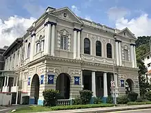 The building was built in the English Renaissance style. The building initially only had a single floor, with the second storey being added in 1888. The building's original porch was torn down around 1910 and the building's entire frontage to Coleman Street was rebuilt.[1] The basement houses the administrative offices and the library. The ground floor houses Madison Rooms, a bar. The Main Meeting Room and the West Temple, which is used for ceremonies, are housed on the second floor, along with the Member's Robing Room, the District Officers Robing Room and the Candidates Robing Room.[2] The Masonic Temple features a domed ceiling and a chequered black-and-white floor.[1] The letter 'G' hangs from the domed ceiling, representing the "Supreme Being".[3] The temple features one of only 11 pipe organs in Singapore. The organ was installed in 1970 and replaced an earlier organ, which was installed in 1920. It underwent significant restoration works in 2014. A bronze bust of William Henry Macleod Read, the second Singaporean Freemason to be initiated, can be found on the staircase leading to the second floor.[1][2]
