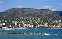 The detailed geography of the massif is complex; it is arranged along three main ridge lines, oriented west/southwest to east/northeast, the maximum altitudes of which decrease from north to south. The most northerly ridge carries at its western end the highest points of the massif: the Signal de la Sauvette 780 m (2,559 ft) and Notre-Dame-des-Anges 767 m (2,516 ft) peaks. Further south, an intermediate ridge culminates at 648 m (2,126 ft) not far from the Chartreuse de la Verne. Finally, the coastal link reaches only 528 m (1,732 ft) above Cavalaire-sur-Mer.[2]