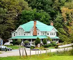 The Mast Farm is a historic farm located near Valle Crucis, Watauga County, North Carolina and is now the Mast Farm Inn. In the late 1700s, Joseph Mast walked from Pennsylvania and settled on much of the land that is now Valle Crucis. Around 1810, his son David built the two-room log cabin which now sits facing the main house at the Mast Farm. David's son Andrew began building the main house around 1880. Andrew's son, D. Finley Mast, completed it in 1896. A photo of the house in the early 1900s shows a sign stating simply, "BROOKSHIDE FARM, D. FINLEY MAST, ONE HALF MILE TO POST OFFICE." Originally, the main house consisted of only the part closest to the road – three stories high, with two rooms on each floor. Like most large homes with open flames for cooking, it had a detached kitchen. The main house is a two-story frame dwelling with a gable roof. In the early 1900s, Finley and his wife, Josephine, began to make additions to the house and to operate it as an inn. Over a period of about twenty-five years, five different symmetrical additions were completed, ultimately comprising thirteen bedrooms – and one bathroom. Other contributing buildings are an eight-sided gazebo (1890), wash house, spring house, meat house, log woodhouse, apple house (1905), weaving house (c. 1812), blacksmith shop, and gambrel roofed barn. The weaving house served as the original farm house.[2]