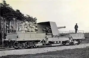 The guns sat on a Vavasseur mount with a gun shield which was bolted to a four-axle, well-base flatcar. The Vavasseur mount was a type of top-carriage recoil system where the gun sat on a cradle that held the trunnioned barrel. When fired a combination of hydraulic buffers and inclined rails returned the gun to position. Once in position, the timber firing platform under the center of the carriage was lowered onto the rails and the carriage was lifted by four jackscrews through the floor of the car. The combination of jackscrews, outriggers, and rail clamps stabilizing the carriage during firing.[4] The gun was capable of 360° of traverse at elevations from +10° to +35° with a maximum range of 12.7 km (7.9 mi) and provided counter-battery fire during the Battle of Verdun.[5]