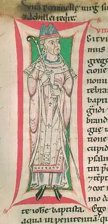 The court had developed since the 12th century to a central institution of royal and princely power. The most important tasks were the visualization of the rule through festivals, art and literature. The term "court" can be understood as "presence with the ruler".[119] In contrast to the Brunswick court of the Guelphs, Matilda's court offices cannot be verified.[120] Scholars such as Anselm of Lucca, Heribert of Reggio and Johannes of Mantua were around the Margravine. Matilda encouraged some of them to write their works:[121] for example, Bishop Anselm of Lucca wrote a psalter at her request and Johannes of Mantua a commentary on the Song of Songs and a reflection on the life of Virgin Mary. Works were dedicated or presented to Matilda, such as the Liber de anulo et baculo of Rangerius of Lucca, the Orationes sive meditationes of Anselm of Canterbury, the Vita Mathildis of Donizo, the miracle reports of Ubald of Mantua and the Liber ad amicum of Bonizo of Sutri.[122] Matilda contributed to the distribution of the books intended for her by making copies. More works were dedicated only to Henry IV among their direct contemporaries.[123][124] As a result, the Margravine's court temporarily became the most important non-royal spiritual center of the Salian period. It also served as a contact point for displaced Gregorians in the church political disputes. Historian Paolo Golinelli interpreted the repeated admission of high-ranking refugees and their care as an act of charity.[125] As the last political expellee, she granted asylum for a long time to Archbishop Conrad I of Salzburg, the pioneer of the canon reform. This brought her into close contact with this reform movement.[126]
