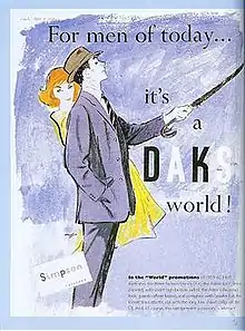 His drawings of groups of impeccably dressed and homosocial male figures, virtually always depicted in a smiling and relaxed attitude, became the signature style of Simpson’s and DAKS men’s wear press advertising right up until the early 1960s.