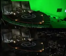 Upon finding the building for the Aesir Headquarters it took eight weeks in pre-production to build the set and another week for the special effects team to install the squibs.[15] The outside top half of the building was completely made of CG, by Mr.X, giving it a more high tech look. Using Google Earth they were able to find out the building's geometry. No location could be found for a rooftop helipad so a set was built in front of a green screen. Soho VFX attached the helipad to the building and set it atop New York City.[16]