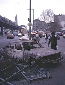 The underground station at Görlitzer Bahnhof, a center of the unrest, was set on fire, with hundreds of protestors drumming on the cast-iron struts of the elevated railway in order to make noise. The station had to be closed for several weeks until repairs were complete.