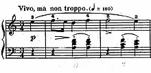 The final mazurka is the shortest of the set, taking less than a minute to perform. It is a rare example of humour in Chopin's music. Written in the joyful key of C major and marked Vivo (meaning lively), it features a constantly repeating theme which has a jokeful character. The piece ends abruptly with the same motif of the opening bars, repetitive octaves of G. The ending is unusually marked Senza fine - literally without end.[5]