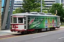 Car 122 was built to a standard American design by the J. G. Brill Company of Philadelphia in 1909[2] for export to Porto, Portugal. Rosie is similar to early streetcars that once operated in Dallas. 122 was retired from service on the Porto streetcar system in 1978,[21] and was brought to the U.S. in the early 1980s by Gales Creek Enterprises (GCE), of Oregon, purchased by Portland businessmen Bill and Sam Naito for possible use on a then-proposed heritage streetcar line in Portland. GCE refurbished it at the Oregon Electric Railway Museum for use, on loan, in the first San Francisco Historic Trolley Festival, in summer 1983, and car 122 operated intermittently in service on San Francisco's Market Street in that year; it was painted yellow-and-cream,[22] the colors of its sponsor in the Trolley Festival, Eastman Kodak.[23] In fall 1984, No. 122 was sold to MATA, and it arrived in Dallas around the beginning of 1985. Having previously been refurbished for use in San Francisco, 122 only needed minor work to bring it into service on MATA's opening day. However, in the late 1990s car 122 received a more extensive restoration. Shortly afterward, 122 developed motor problems which kept it in the barn. These problems have been solved and 122 is currently the oldest streetcar in daily service in North America.[24]