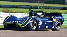 The McLaren M1A, and its derivatives, the McLaren M1B[4] and the McLaren M1C, are a series of mid-engined Group 7 sports prototype race cars built by McLaren, between 1963 and 1968.[5][6][7][8] The M1A was the team's first self-designed and developed sports car. Later versions, such as the 'M1B' and 'M1C', competed and raced in the North American Can-Am series, starting in 1966 season.[9][10][11] The car was raced in North America and Europe in 1963 and 1964 in various Group 7 and United States Road Racing Championship series events. 24 examples of the M1A and M1B were built, and 25 examples of the M1C were manufactured.[12] They were powered by a few different motors, including Chevrolet small-block engine, an Oldsmobile V8 engine, a Chevrolet big-block engine, and even a Ford FE engine.[13][14] It was constructed out of a tubular space frame chassis, and, combined with its light weight of 551 kg (1,215 lb) this gave it a great power-to-weight ratio.[15] The 4.5 L (270 cu in) Oldsmobile V8 engine developed around 310 hp (230 kW),[16] while the 350 cu in (5.7 L) Chevrolet small-block V8 engine was capable of developing over 550 hp (410 kW), and 538 lb⋅ft (729 N⋅m) of torque.[17][18] This drove the rear wheels through a Hewland L.G.500 four-speed manual transmission.[19]