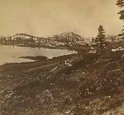 By late June, a 160-acre townsite was laid out by a surveyor hired by Virginia City promoters A. C. "Alex" Wightman and Charley Parker.[9][10] Summit City, as it was named, was a planned community with streets intersecting at right angles and named in lettered order in one direction and numerical order in the other, and a plaza at its heart.[11] By late summer, Summit City reportedly had 10 stores, five lumberyards, 10 hotels, five blacksmith shops, many, many bars, gambling houses, a brewery, a book and stationery store, a cigar store, a barbershop, a church, and a 10 piece brass band. An excursion vessel ferried revelers to four hurdy-gurdy houses (dance halls) at the lake's upper end.[12] Not satisfied with a private school, the citizens petitioned the Board of Supervisors to create a school district. Soon, the Board created the Altamont school district.[13] Summit City had more businesses than any other town in Nevada County except Nevada City and Grass Valley.[14] About 150 houses had been erected.[15] A stage ran daily to Virginia City and a tri-weekly Pony Express ran from Nevada City.[16] Tollroads spidered out from the town in various directions, including to the Henness Pass road, and to the Central Pacific Railroad in Cisco.[17] Prominent residents included Mark Twain's brother, lawyer Orion Clemens. The town had a court, presided over by Judge Jones, a jail, a marshal and several other lawyers.[18]