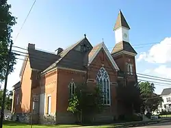 Mechanicsburg's Methodist Protestant church was organized on February 13, 1853, following a directive by the denomination's Ohio Conference from the previous September. Under the initial leadership of S.P. Kezerta, the fledgling church had a charter membership of ninety-two individuals.[2]:600 The national Methodist Protestant Church had been formed by those who dissented from the church government of the Methodist Episcopal Church, objecting to the powers of the church's bishops.[3] Matters were radically different in Mechanicsburg,[4]:473 which had developed a reputation as a "black abolition hole" among those pursuing the many runaway slaves who passed through the town on the Underground Railroad.[5]:4 Turmoil in the national church disturbed many members of the Mechanicsburg Methodist Episcopal Church, and Kazerta gathered a congregation of abolitionist families into a new congregation. The members purchased a lot on West Sandusky Street, upon which a two-story brick church was constructed in 1858.[4]:474 Mechanicsburg's Masonic lodge assisted in construction, and in return they were sold rights to the second story. In its early years, the congregation was weakened by members' departures to other communities or by death, and it was attached to another young congregation in Catawba until 1865.[2]:600 As the years passed, the church grew stronger; membership reached 308 in 1879, at which time the building was remodelled and refurbished, and by 1890 a new building was needed. After concluding the lease with the Masons, the congregation destroyed the old building and erected a new structure on the same lot, and all debts were paid by the end of 1891. It was further strengthened by donations from two members: one gave his home for use as a parsonage, and the other endowed the church's Sunday school. By 1917, the membership had surpassed five hundred.[2]:474 In 1939, the Methodist Protestant Church merged back into the Methodist Episcopal Church, producing The Methodist Church,[6] and the two local congregations subsequently rejoined as well. After the merger, the property was sold to a local Baptist congregation.[7]