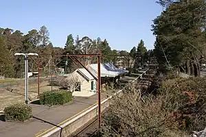 Medlow Bath railway station is a heritage-listed railway station located on the Main Western line in Medlow Bath in the City of Blue Mountains local government area of New South Wales, Australia. It was designed by NSW Government Railways and built from 1902 to 1922. The property was added to the New South Wales State Heritage Register on 2 April 1999.[2] The station opened on 21 January 1880 as Browns Siding Pulpit Hill, and was renamed Medlow on 1 March 1883 and Medlow Bath on 1 October 1903.[3]