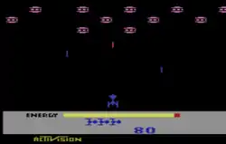After being hired by Activision, Cartwright had to develop a game.[7] He recalled the influence to create the game was after he had seen Astro Blaster at a Chuck E. Cheese restaurant.[8] Cartwright developed a ship similar to that of Astro Blaster. On designing the ship, he realized how simple the graphics had to be for the system with eight bits and one color for the ship.[9]