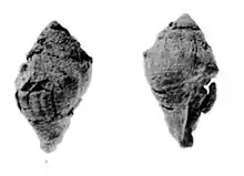 The shell shows a characteristic stout biconic profile and 11-12 strong nodes encircling the body whorl. The Kern River specimens differ somewhat by having a uniformly lower spire with sutures riding up higher onto preceding whorls so that only the nodes on the body whorl are exposed.[2]