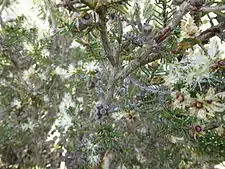 This species flowers profusely with many heads of white flowers on the sides of the branches. Each head is up to 15 mm (0.6 in) in diameter and contains one to six individual flowers. The stamens are arranged in five bundles around the flowers and there are 8 to 12 stamens per bundle. The main flowering period is in early spring and is followed by fruit which are woody capsules 3–4.2 mm (0.12–0.17 in) long.[2][3]