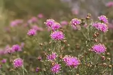 Melaleuca psammophila is a plant in the myrtle family, Myrtaceae, and is endemic to the south-west of Western Australia. It is a small shrub with narrow leaves, heads of purple, pink or mauve flowers and clusters of woody fruit. It is similar to M. bisulcata but differs from that species in characters such as the shape of its fruit, leaves and buds but like that species is an attractive, profusely flowering shrub suitable for cultivation as a garden plant.