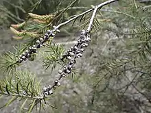 The flowers are white or pinkish, arranged in spikes on the ends of branches which continue to grow after flowering. The spikes contain 5 to 20 groups of flowers in threes, or sometimes individual flowers, and are up to 20 mm (0.8 in) in diameter and 20 mm (0.8 in) long. The flower buds are woolly. The stamens are arranged in five bundles around the flowers and each bundle contains 11 to 25 stamens. Flowering occurs in the spring and is followed by fruit which are woody, cup-shaped capsules 3–4.5 mm (0.1–0.2 in) long in loose clusters.[2][3][4]