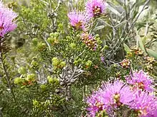 The flowers are a shade of pink to purple and are arranged in heads on the ends of branches which continue to grow after flowering. The heads contain 2 to 6 groups of flowers in threes and are up to 16 mm (0.6 in) in diameter. The stamens are arranged in five bundles around the flowers and each bundle contains 3 to 7 (but mostly 3) stamens. Flowering occurs between August and January and is followed by fruit which are woody capsules 2.5–4 mm (0.1–0.2 in) long in loose clusters.[2][3]