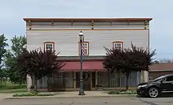 The building is a two-story, clapboarded Italianate commercial block with a false front.