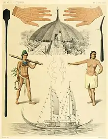 Mentawai islander's tattoo, great house of Pora, and war boat knabat bogolu.