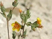 The inflorescence is a narrow series of clusters of small flowers, each flower accompanied by a single toothed bract with a white base and green tip. The five yellow petals of the flower are up to 7 millimeters long and are sometimes marked with red at the bases.[1]